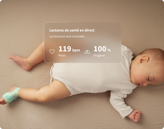 ● Sachez quand votre bébé a besoin de vous : Si les résultats de santé de votre bébé se situent en dehors des plages prédéfinies, des lumières et des sons sur la station de base ainsi que des notifications vous en avertiront en temps réel.